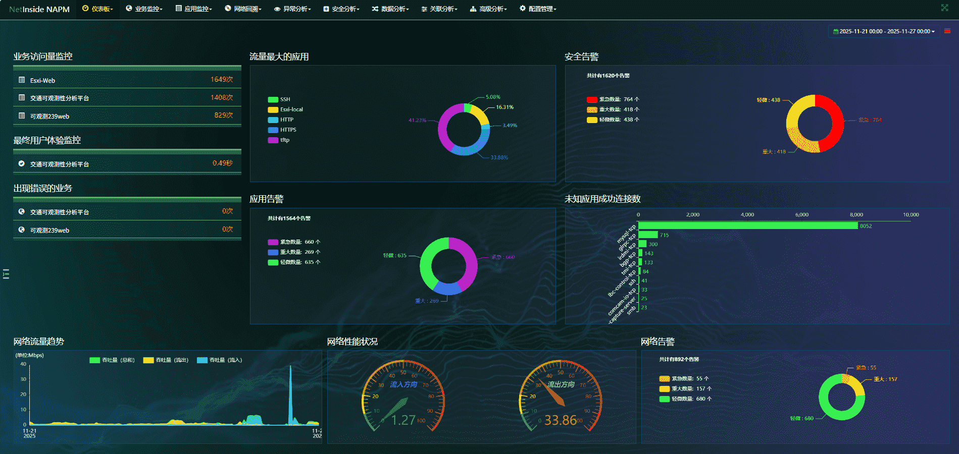 NetInside全流量回溯分析系统-TTRA基于旁路采集技术,在不改变政务网络架构、不影响业务运行的前提下,实现从“流量采集-存储-分析-回溯”的全链路覆盖,已在某部委、某省级政务云、某直辖市水务局等多家政企节点落地验证,成为政务网络运维的核心支撑工具。